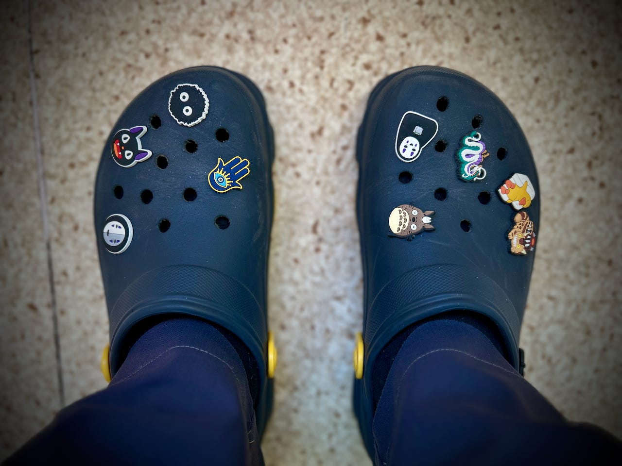 Доктор усмехнулся и взгляд опустился на его кроксы. В нескольких дырках каждого его башмака были закреплены фигурки из мира Миядзаки. Тоторо, котавтобус, голова какого-то черного кота, еще какой-то черный чудик, и два безликих по бокам.